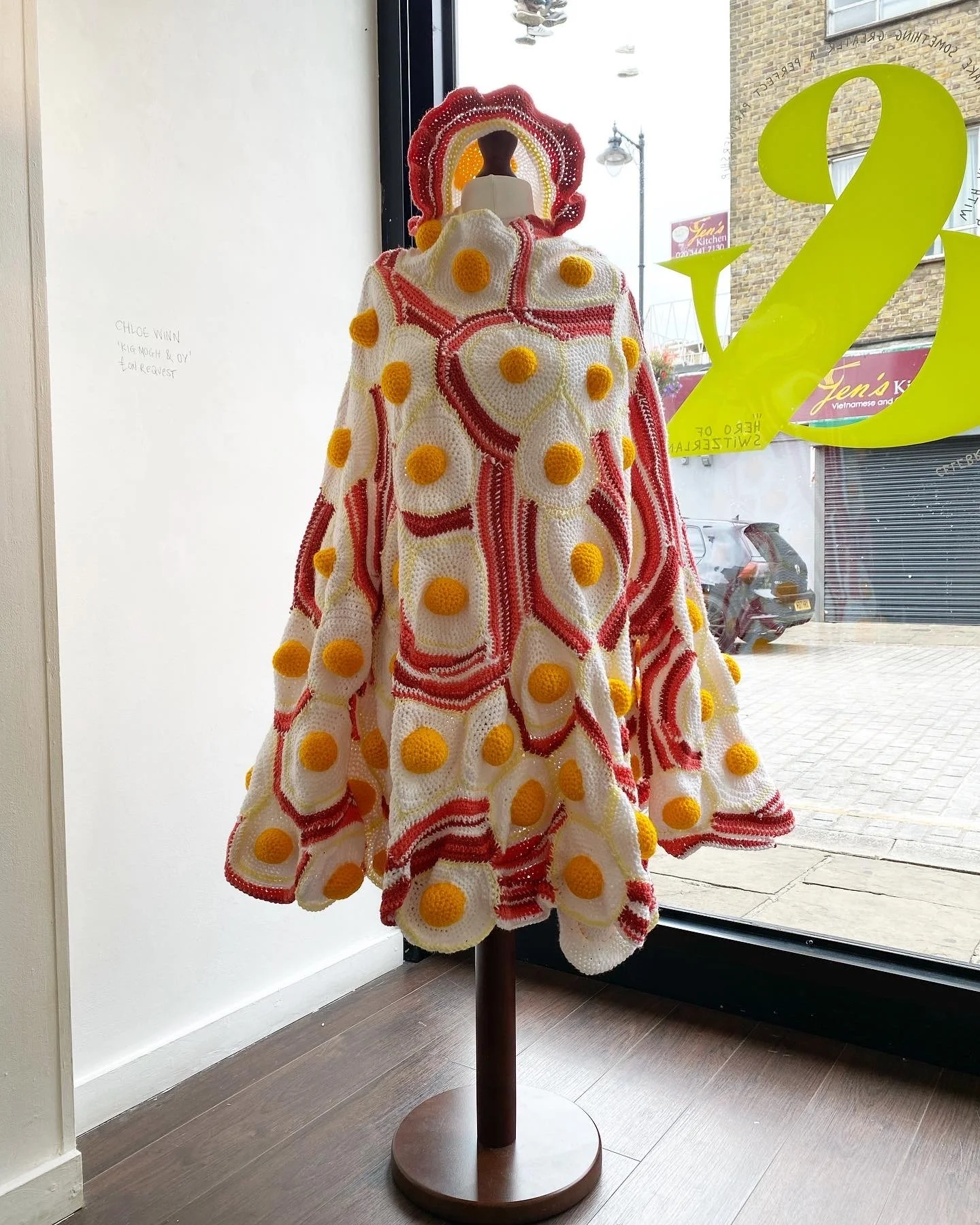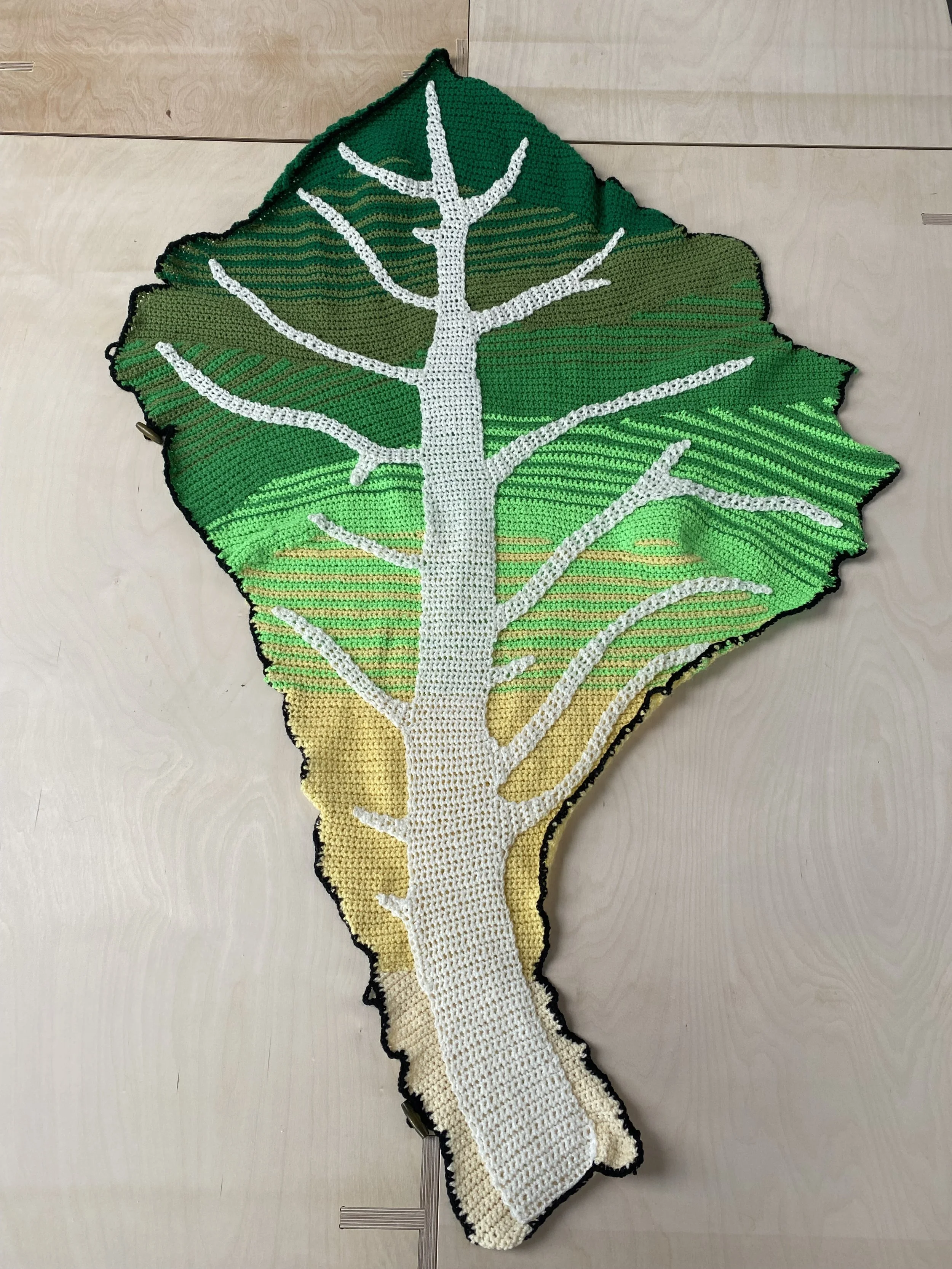 A large crocheted blanket that is shaped to represent a cabbage leaf. It is in many shades of green, cream and white. It also has toggled attached to the sides so it can be used as a cape or blanket wrapped around your shoulders.
